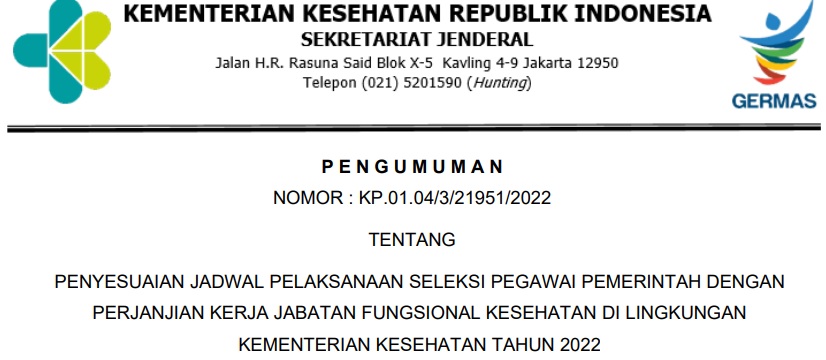 Spesialnews.com - Sesuai dengan surat dari Plt. Kepala Badan Kepegawaian Negara, nomor 36563/B-KS.04.01/SD/K/2022, tanggal 3 November 2022, dan pengumuman Sekjen sebagai Ketua Panitia Seleksi Pengadaan PPPK Kementerian Kesehatan Tahun 2022, nomor KP.01.04/IV/9180/2022, tanggal 31 Oktober 2022, tentang penerimaan PPPK jabatan fungsional kesehatan di Kementerian Kesehatan Tahun 2022